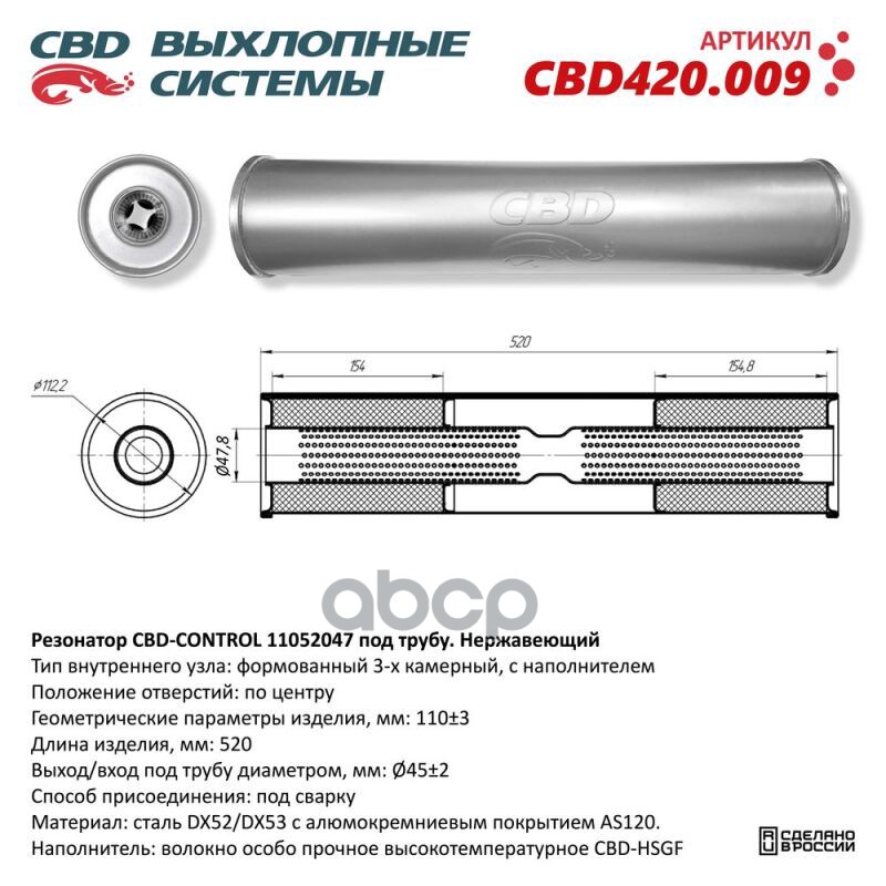 Чтобы купить Резонатор универсальный 11052047 под трубу. ‘CBD’ (нерж.) CBD арт. CBD420009 оптом по цене 2527 руб., свяжитесь с поставщиком. Компания поставщик — For-cars (ИП «Иванов Алексей Валентинович») из города Москва. Доставка возможна самовывоз, транспортной компанией, авиатранспортом, железной дорогой. Способы оплаты: наличными, безналичная оплата, электронные деньги.