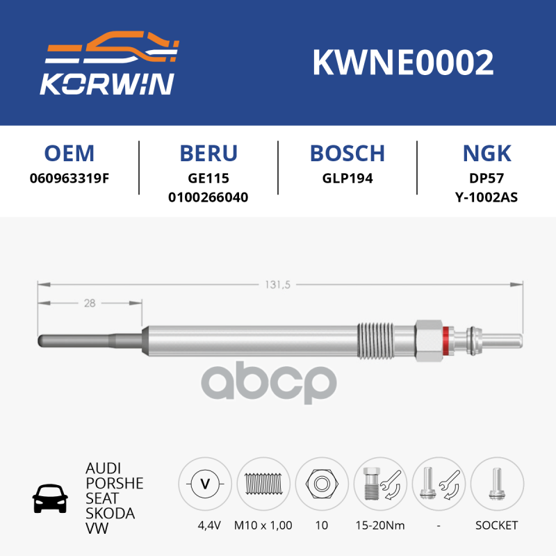 Чтобы купить Свеча накаливания Audi/Porshe/Seat/Skoda/VW пр. Турция KORWIN арт. KWNE0002 оптом по цене 540 руб., свяжитесь с поставщиком. Компания поставщик — For-cars (ИП «Иванов Алексей Валентинович») из города Москва. Доставка возможна самовывоз, транспортной компанией, авиатранспортом, железной дорогой. Способы оплаты: наличными, безналичная оплата, электронные деньги.