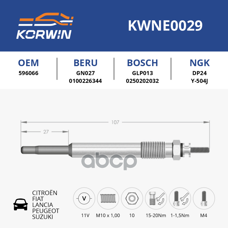 Чтобы купить Свеча накаливания Citroen/Fiat/Lancia/Peugeot/Suzi KORWIN арт. KWNE0029 оптом по цене 387 руб., свяжитесь с поставщиком. Компания поставщик — For-cars (ИП «Иванов Алексей Валентинович») из города Москва. Доставка возможна самовывоз, транспортной компанией, авиатранспортом, железной дорогой. Способы оплаты: наличными, безналичная оплата, электронные деньги.
