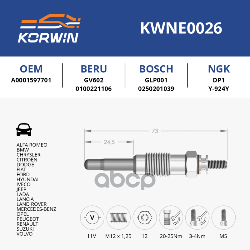 Чтобы купить Свеча накаливания PSA/Hyundai/Mercedes-Benz/Renaul KORWIN арт. KWNE0026 оптом по цене 344 руб., свяжитесь с поставщиком. Компания поставщик — For-cars (ИП «Иванов Алексей Валентинович») из города Москва. Доставка возможна самовывоз, транспортной компанией, авиатранспортом, железной дорогой. Способы оплаты: наличными, безналичная оплата, электронные деньги.