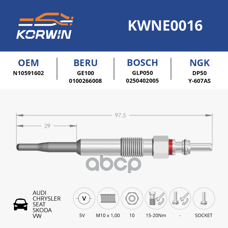 Чтобы купить Свеча накаливания VAG/Chrysler пр. Турция KORWIN арт. KWNE0016 оптом по цене 387 руб., свяжитесь с поставщиком. Компания поставщик — For-cars (ИП «Иванов Алексей Валентинович») из города Москва. Доставка возможна самовывоз, транспортной компанией, авиатранспортом, железной дорогой. Способы оплаты: наличными, безналичная оплата, электронные деньги.