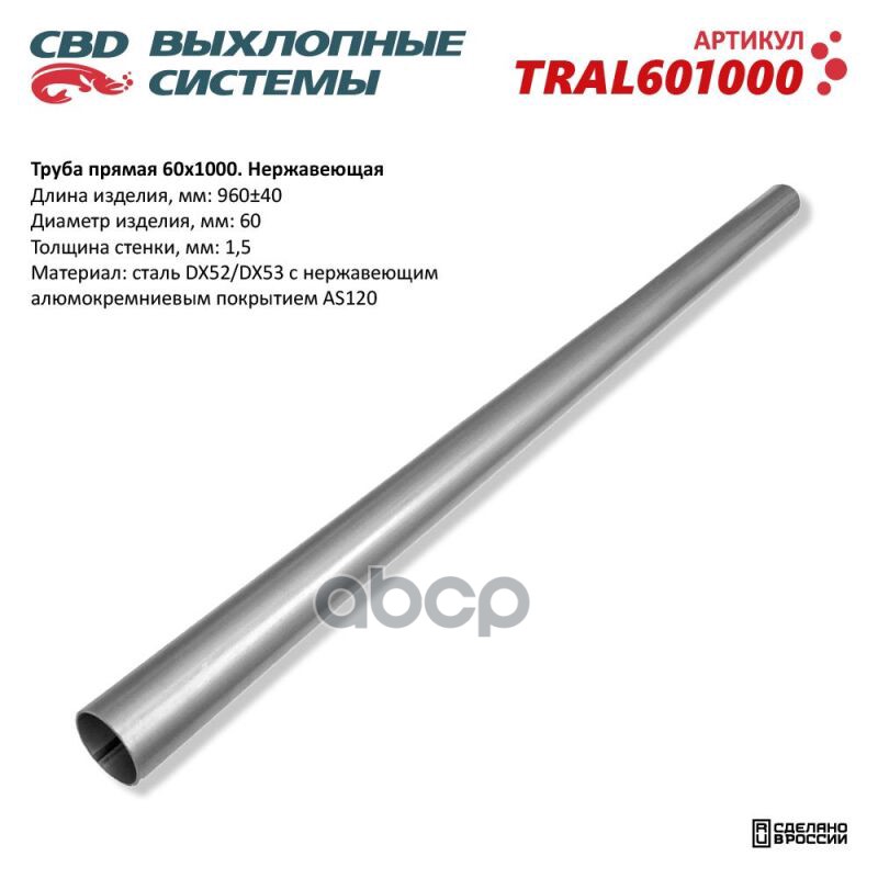 Чтобы купить Труба глушителя прямая 60х1000 мм, алюминизированная сталь CBD арт. TRAL601000 оптом по цене 1212 руб., свяжитесь с поставщиком. Компания поставщик — For-cars (ИП «Иванов Алексей Валентинович») из города Москва. Доставка возможна самовывоз, транспортной компанией, авиатранспортом, железной дорогой. Способы оплаты: наличными, безналичная оплата, электронные деньги.