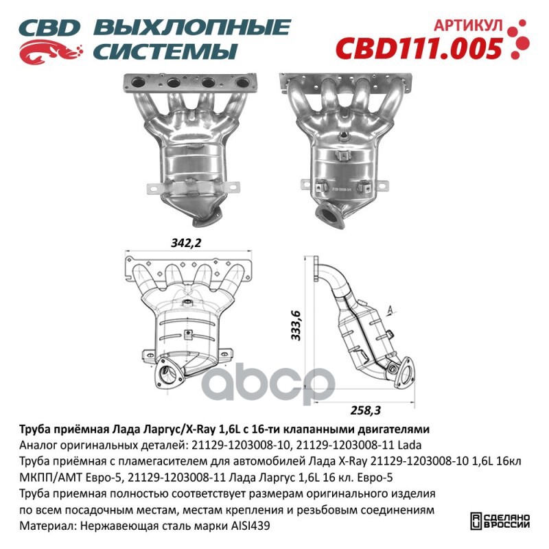 Труба приемная Lada X-Ray 16кл МКПП/АМТ Евро-5 ‘CBD’ с пламегасителем.