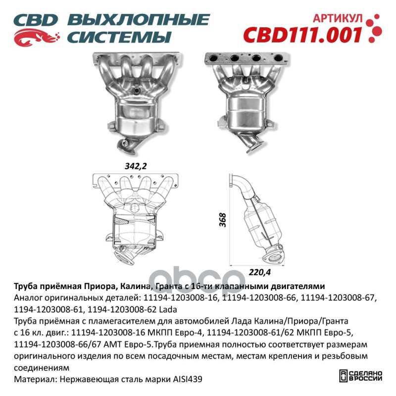 Чтобы купить Труба приемная с пламегасителем для автомобилей Лада Калина/Приора/Гранта с 16 кл. двиг.: 11194-1203008-16 МКПП Евро-4, 11194-1203008-61⁄62 МКПП Евро- CBD арт. CBD111001 оптом по цене 13348 руб., свяжитесь с поставщиком. Компания поставщик — For-cars (ИП «Иванов Алексей Валентинович») из города Москва. Доставка возможна самовывоз, транспортной компанией, авиатранспортом, железной дорогой. Способы оплаты: наличными, безналичная оплата, электронные деньги.