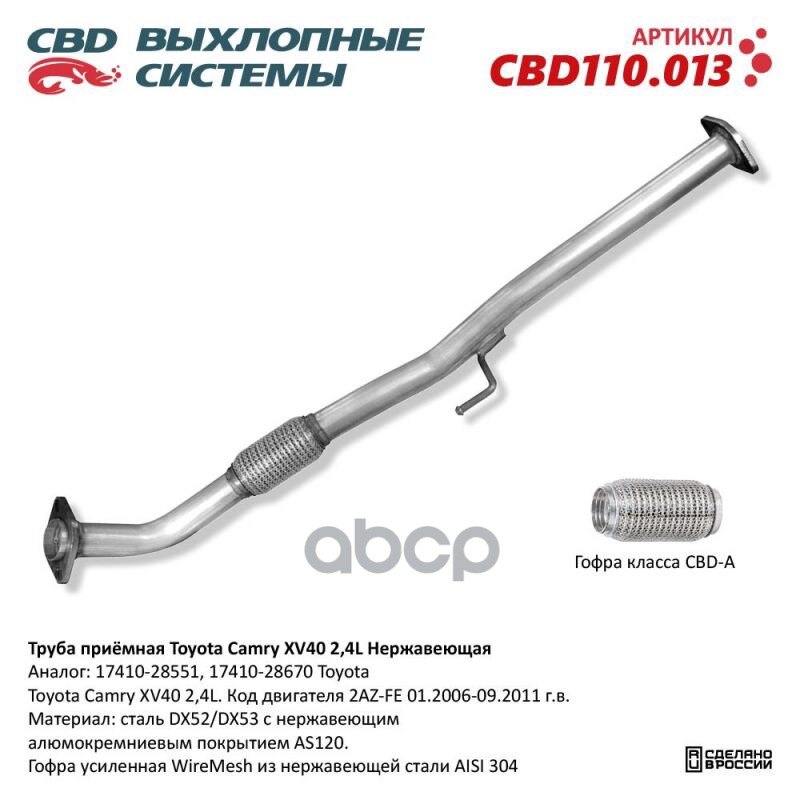 Чтобы купить Труба приемная Toyota Camry XV40 2,4L. Нержавеющая. CBD арт. CBD110013 оптом по цене 4505 руб., свяжитесь с поставщиком. Компания поставщик — For-cars (ИП «Иванов Алексей Валентинович») из города Москва. Доставка возможна самовывоз, транспортной компанией, авиатранспортом, железной дорогой. Способы оплаты: наличными, безналичная оплата, электронные деньги.