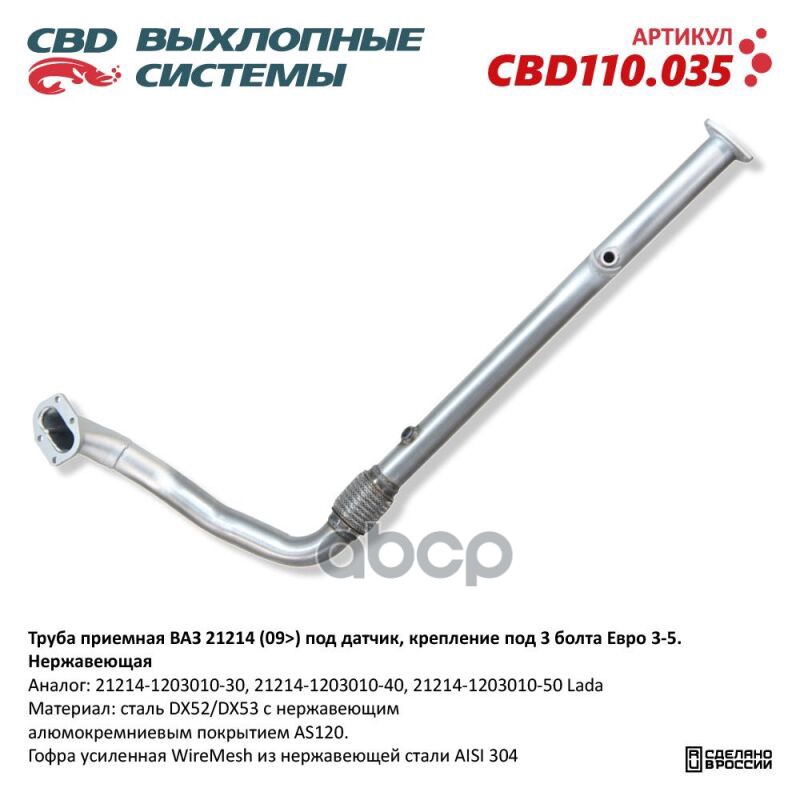 Чтобы купить Труба приёмная ВАЗ 21214 (09>) под датчик, крепление на 3 болта Евро 3-5. Нержавеющая. CBD арт. CBD110035 оптом по цене 4134 руб., свяжитесь с поставщиком. Компания поставщик — For-cars (ИП «Иванов Алексей Валентинович») из города Москва. Доставка возможна самовывоз, транспортной компанией, авиатранспортом, железной дорогой. Способы оплаты: наличными, безналичная оплата, электронные деньги.