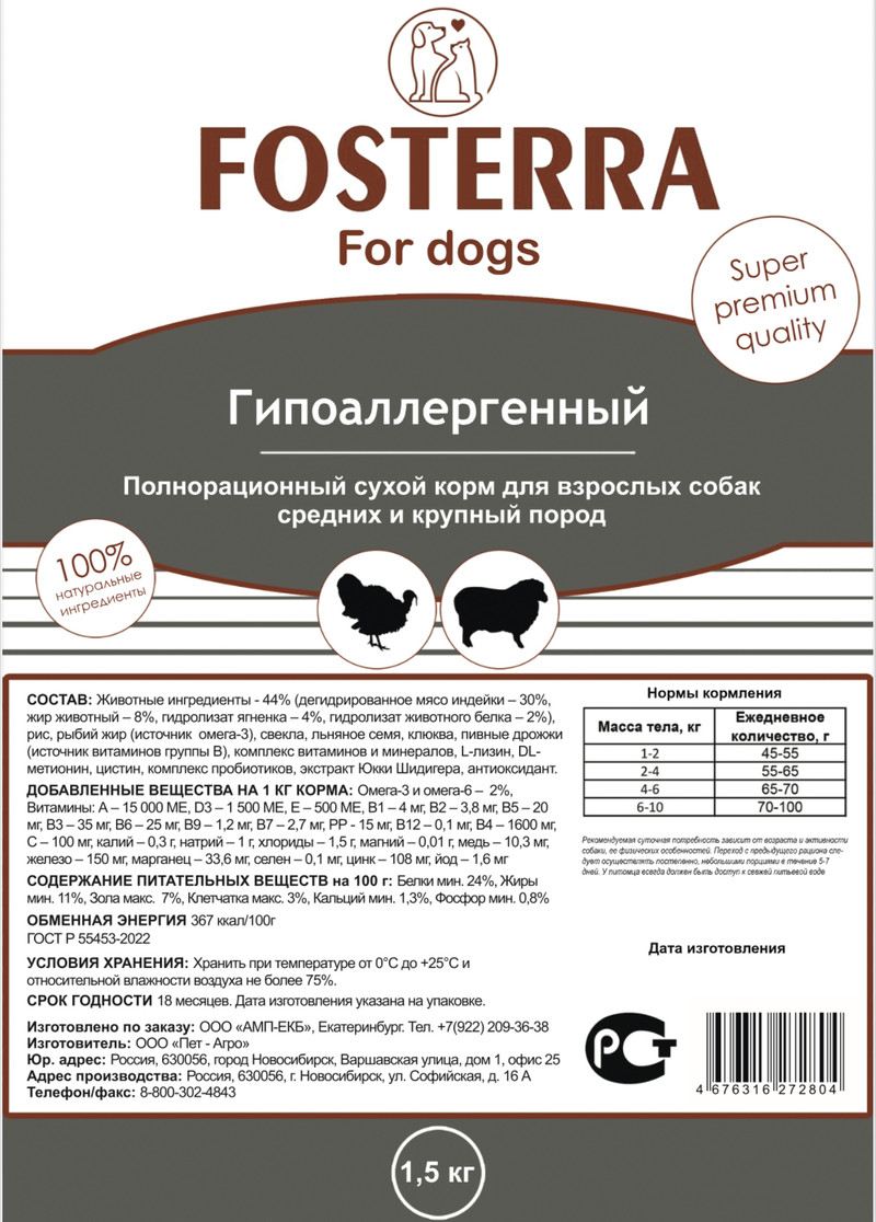 Чтобы купить Гипоаллергенный корм для собак средних и крупных пород Fosterra 1.5 кг с Ягненком 4676316272804 оптом по цене 850 руб., свяжитесь с поставщиком. Компания поставщик — Fosterra (ИП «Попенов А.М») из города Екатеринбург (Свердловская область). Минимальная партия 5 шт. Доставка возможна самовывоз, транспортной компанией, автомобилем, курьером, авиатранспортом, железной дорогой. Способы оплаты: наличными, безналичная оплата, кредитные карты, электронные деньги.