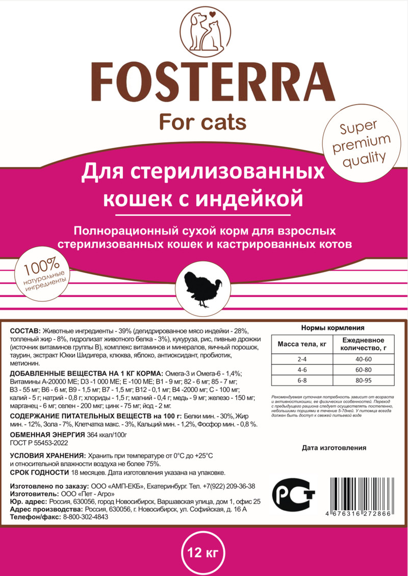 Чтобы купить Сухой полнорационный корм для стерилизованных кошек Fosterra 12 кг С Индейкой 4676316272866 оптом по цене 4600 руб., свяжитесь с поставщиком. Компания поставщик — Fosterra (ИП «Попенов А.М») из города Екатеринбург (Свердловская область). Минимальная партия 5 шт. Доставка возможна самовывоз, транспортной компанией, автомобилем, курьером, авиатранспортом, железной дорогой. Способы оплаты: наличными, безналичная оплата, кредитные карты, электронные деньги.