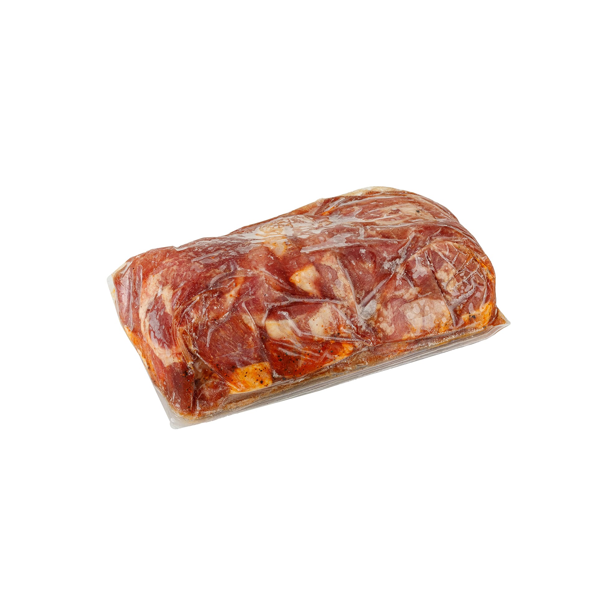 Товар поставляется в индивидуальных упаковках вес нетто которых в среднем около 2,2 кг. Точный вес товара будет зафиксирован при отгрузке, а стоимость заказа будет пересчитана менеджером. Полуфабрикат мясной мелкокусковой бескостный, категории Б. Состав: свинина, вода, соль, специи. В 1 кг не менее 900 г основного компонента. Способ приготовления: запекать, жарить до готовности.
