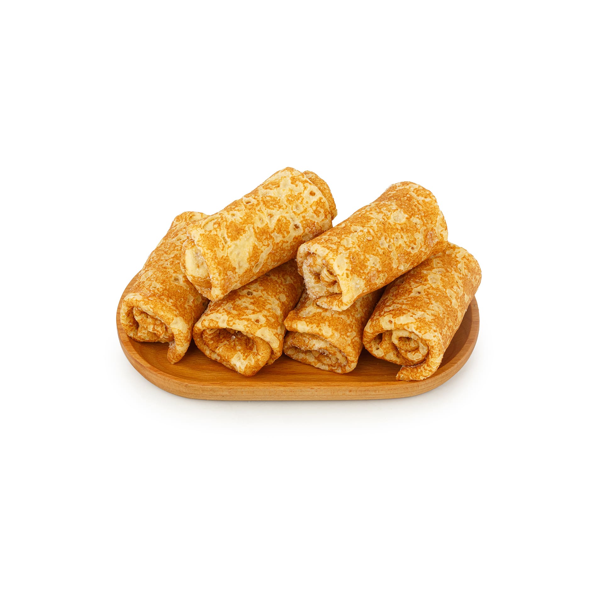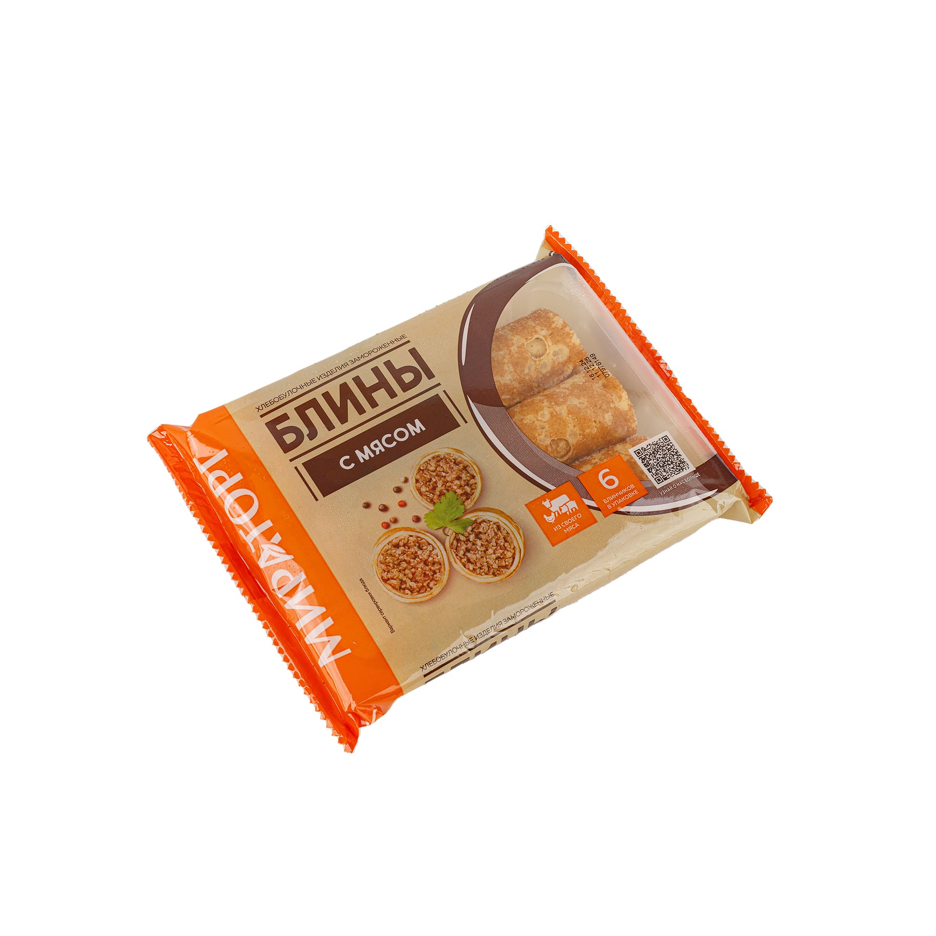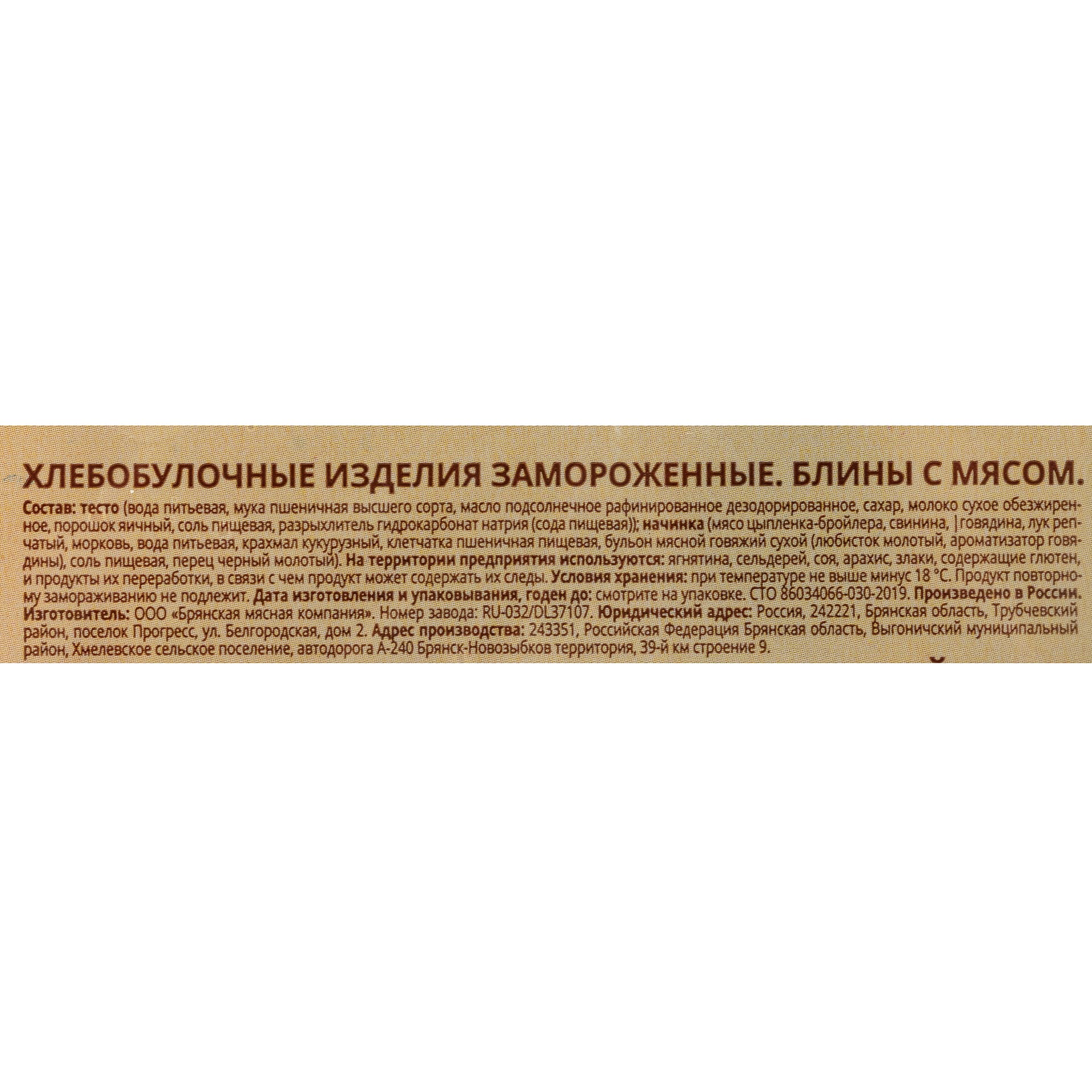 В упаковке 6 блинчиков. Состав: тесто: вода питьевая, мука пшеничная высшего сорта, масло подсолнечное рафинированное дезодорированное, сахар, молоко сухое обезжиренное, порошок яичный, соль пищевая, разрыхлитель гидрокарбонат натрия (сода пищевая); начинка: мясо цыплёнка-бройлера, свинина, говядина, лук репчатый, морковь, вода питьевая, крахмал кукурузный, клетчатка пшеничная пищевая, бульон мясной говяжий сухой (любисток молотый, ароматизатор говядины), соль пищевая, перец чёрный молотый. На территории предприятия используются: ягнятина, сельдерей, соя, арахис, злаки, содержащие глютен и продукты их переработки, в связи с чем продукт может содержать их следы.