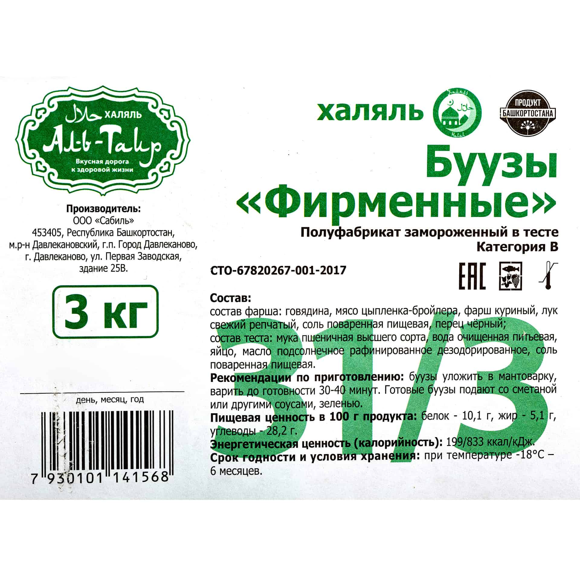 В коробке 40 шт (вес одной штуки 75 г). Состав: фарш: говядина, мясо цыпленка бройлера, фарш куриный, лук репчатый свежий, соль поваренная пищевая, перец чёрный; тесто: мука пшеничная высшего сорт, вода очищенная питьевая, яйцо, масло подсолнечное рафинированное дезодорированное, соль поваренная пищевая. Этот продукт приготовлен в соответствии с нормами халяль. Для просмотра других продуктов халяль перейдите в соответствующую категорию (также можно воспользоваться тегом “халяль” в фильтрах в товарном каталоге).