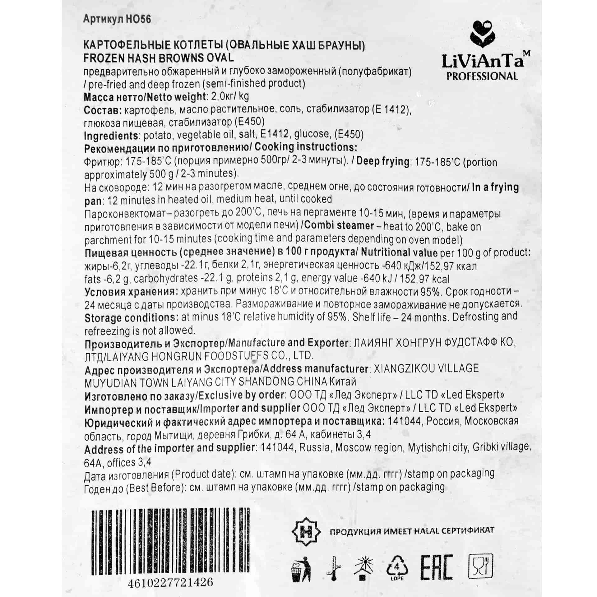 Чтобы купить Котлетки картофельные (хашбраун) халяль полуфабрикат замороженный LiViAnTa 2 кг оптом по цене 741 руб., свяжитесь с поставщиком. Компания поставщик — Фростопт (ООО «ЛЕДКОФФ») из города Москва. Минимальная сумма оптового заказа: 6000 руб. Доставка возможна самовывоз, транспортной компанией, автомобилем. Способы оплаты: наличными, безналичная оплата, кредитные карты, электронные деньги.