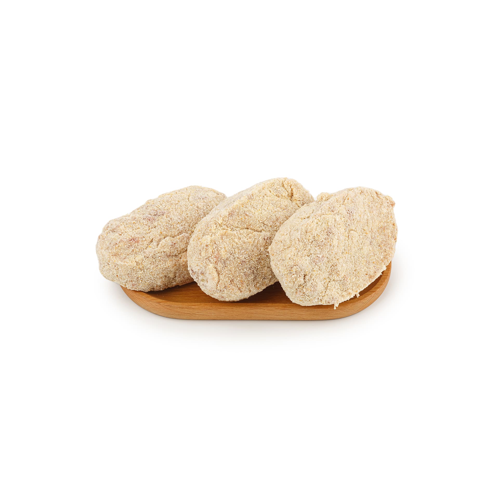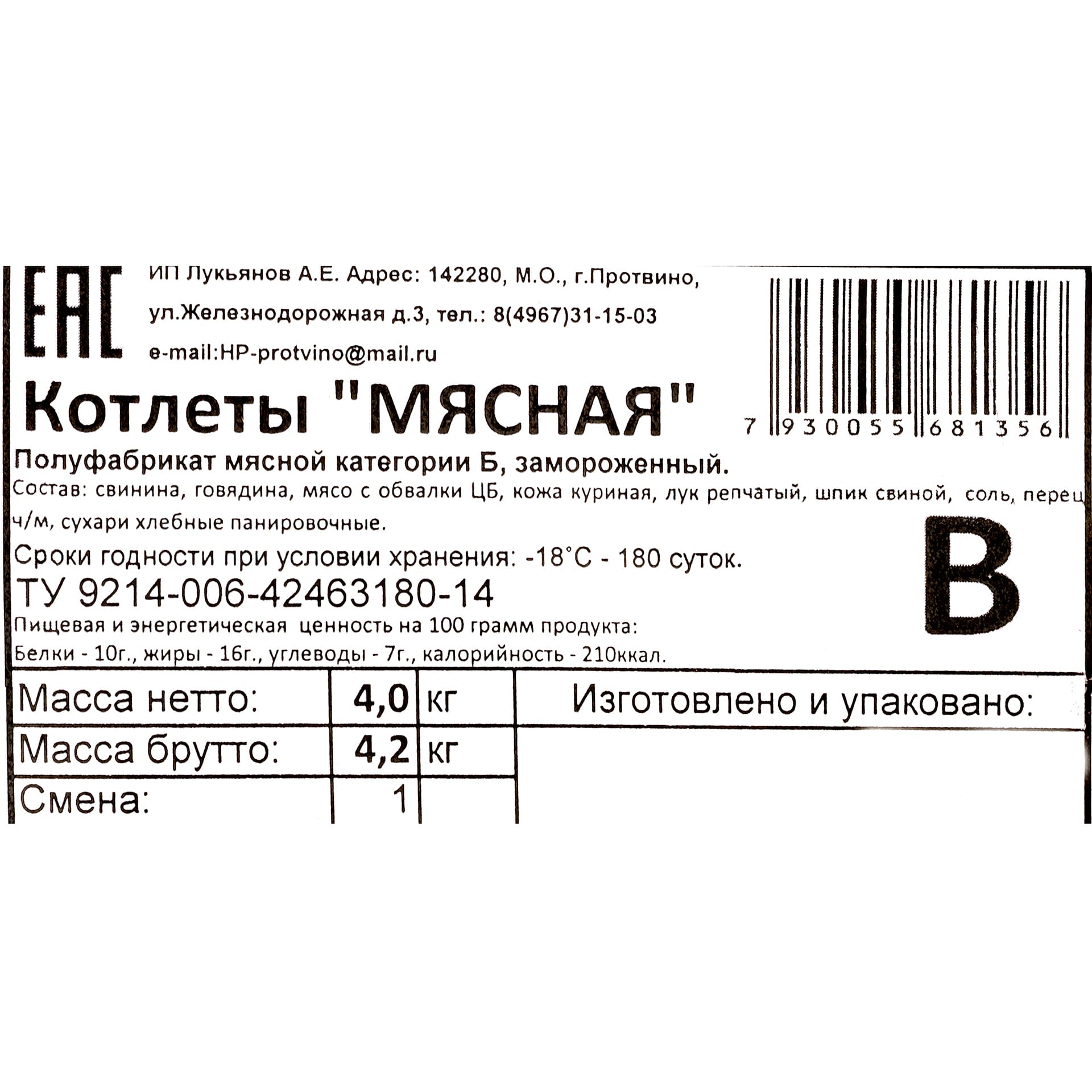 Состав: свинина, говядина, мясо цыплёнка-бройлера механической обвалки, кожа куриная, лук репчатый, шпик свиной, соль, перец чёрный молотый, сухари хлебные панировочные.