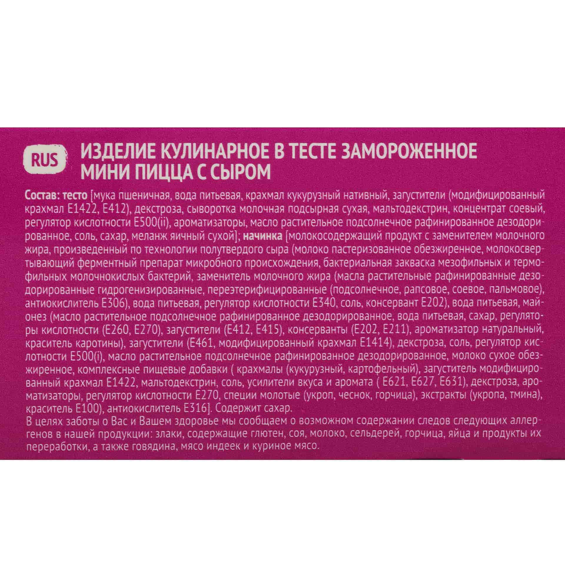 Состав: тесто: мука пшеничная, вода питьевая, крахмал кукурузный нативный, загустители (модифицированные крахмал E1422, E412), декстроза, сыворотка молочная подсырная сухая, мальтодекстрин, концентрат соевый, регулятор кислотности E500(ii), ароматизаторы, масло растительное подсолнечное рафинированное дезодорированное, соль, сахар, меланж яичный сухой; начинка: молокосодержащий продукт с заменителем полочного жира, произведённый по технологии полутвёрдого сыра (молоко пастеризованное обезжиренное, молокосвёртывающий ферментный препарат микробного происхождения, бактериальная закваска мезофильных и термофильных молочнокислых бактерий, заменитель молочного жира (масла растительные рафинированные дезодорированные гидрогенизированные, переэтерифицированные (подсолнечное, рапсовое, соевое, пальмовое), антиокислитель E306), вода питьевая, регулятор кислотности E340, соль, консервант E202), вода питьевая, майонез (масло растительное подсолнечное рафинированное дезодорированное, вода питьевая, сахар, регуляторы кислотности (E260, E270), загустители (E412, E415), консерванты (E202, E211), ароматизатор натуральный, краситель каротины), загустители (E461, модифицированные крахмал E1414), декстроза, соль, регулятор кислотности E500(i), масло растительное подсолнечное рафинированное дезодорированное, молоко сухое обезжиренное, комплексные пищевые добавки (крахмалы (кукурузный, картофельный), загуститель модифицированный крахмал E1422, мальтодекстрин, соль, усилители вкуса и аромата (E621, E627, E631), декстроза, ароматизаторы, регулятор кислотности E270, специи молотые (укроп, чеснок, горчица), экстракты (укропа, тмина), краситель E100), антиокислитель E316. Содержит сахар. Возможно содержание следов следующих аллергенов: злаки, содержащие глютен, соя, молоко, сельдерей, горчица, яйца и продукты их переработки, а также говядина, мясо индеек и куриное мясо.