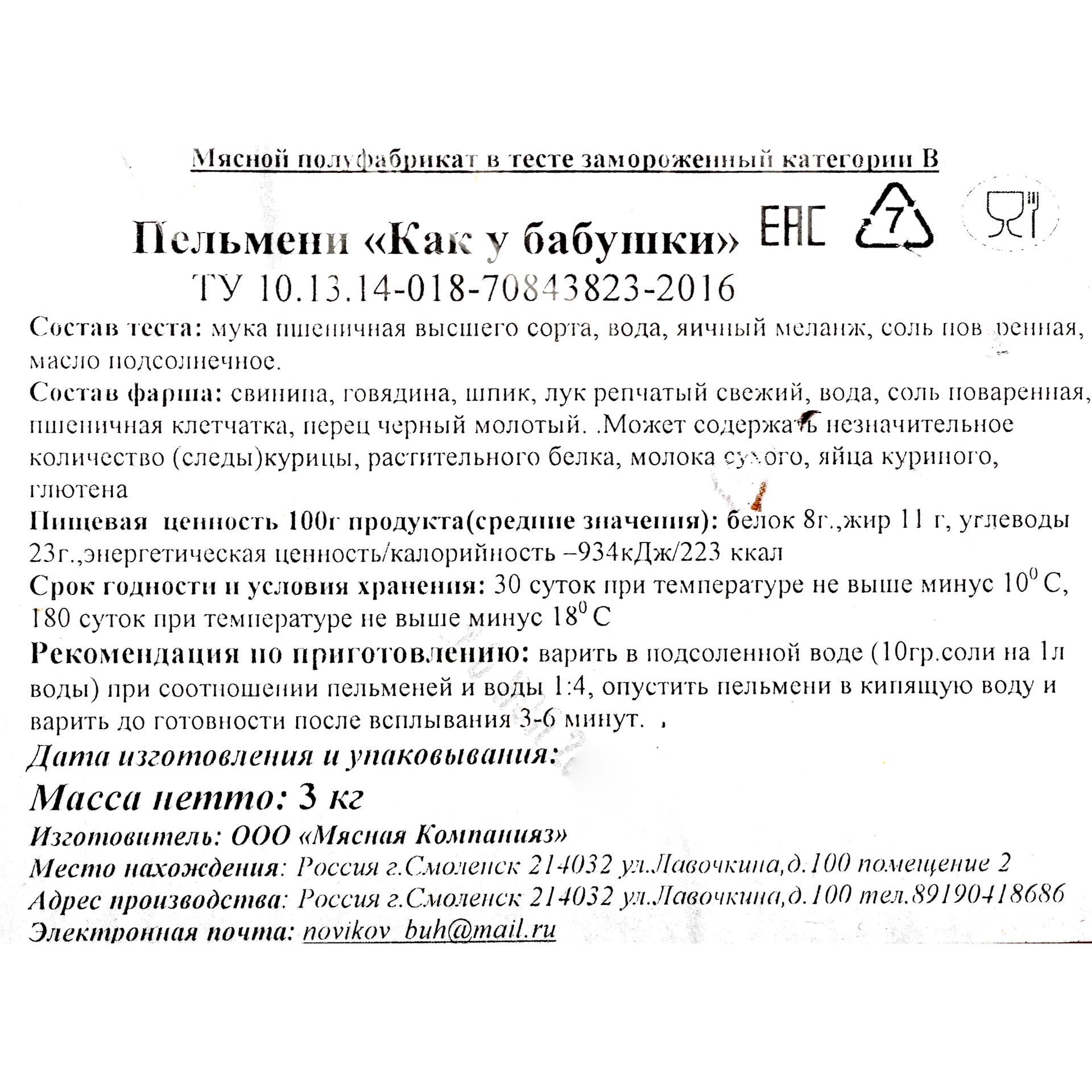 Состав: тесто: мука пшеничная высшего сорта, вода, яичный меланж, соль поваренная, масло подсолнечное; фарш: свинина, говядина, шпик, лук репчатый свежий, вода, соль поваренная, пшеничная клетчатка, перец чёрный молотый. Может содержать незначительное количество (следы): курицы, растительного белка, молока сухого, яйца куриного, глютена.