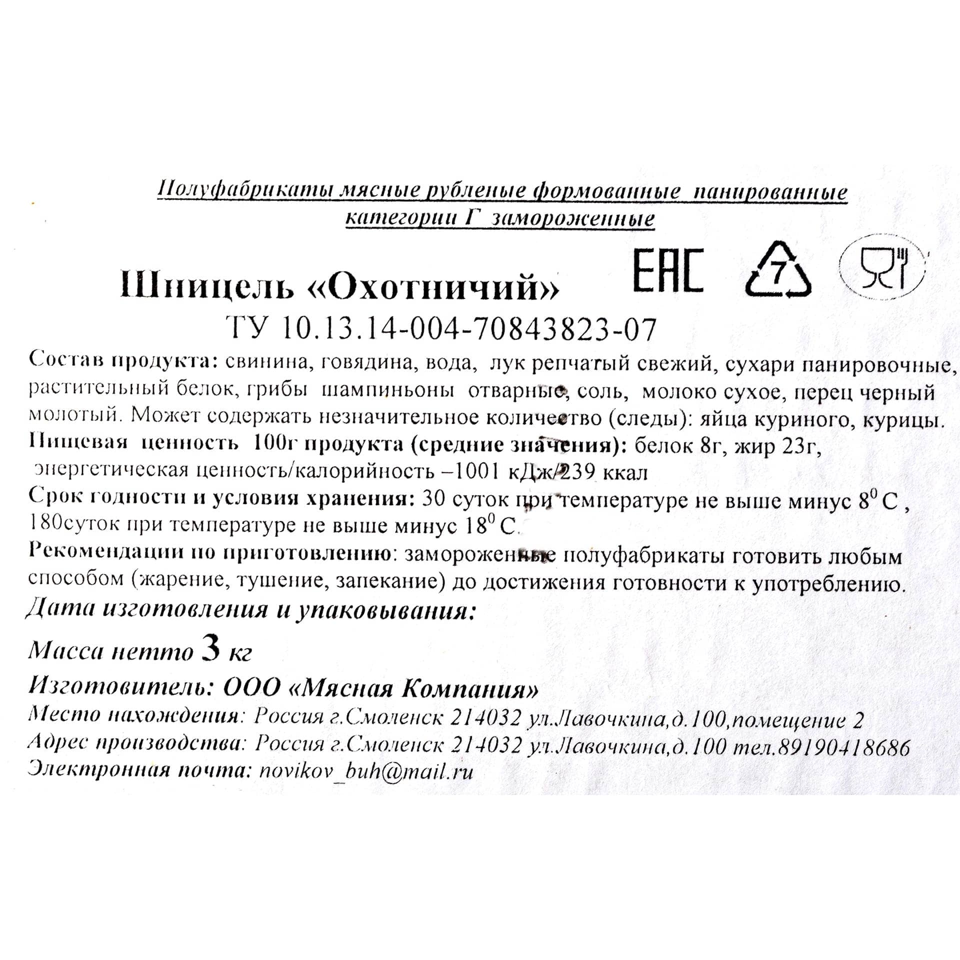 Чтобы купить Шницель из свинины и говядины “Охотничий” полуфабрикат замороженный Смоленский мастер 3 кг оптом по цене 1199 руб., свяжитесь с поставщиком. Компания поставщик — Фростопт (ООО «ЛЕДКОФФ») из города Москва. Минимальная сумма оптового заказа: 6000 руб. Доставка возможна самовывоз, транспортной компанией, автомобилем. Способы оплаты: наличными, безналичная оплата, кредитные карты, электронные деньги.