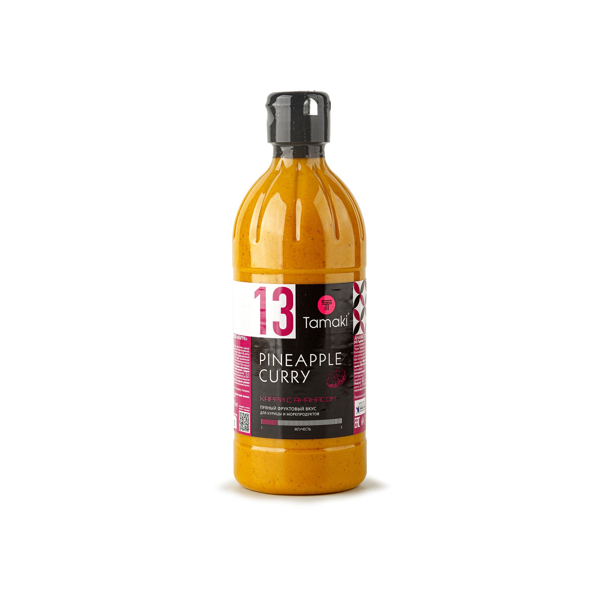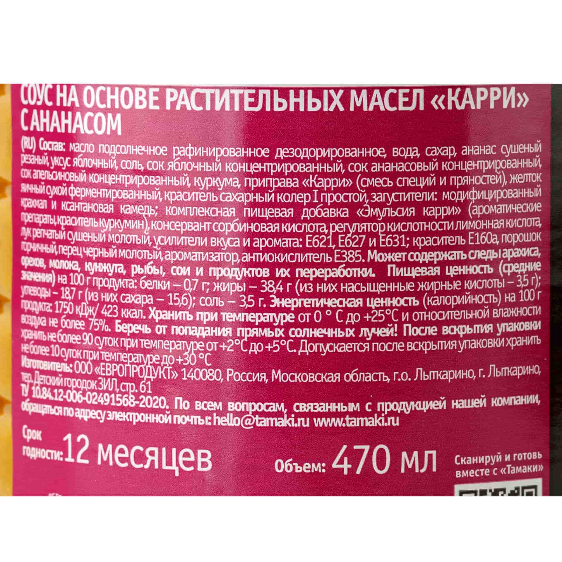 Пряный фруктовый вкус для курицы и морепродуктов. Состав: масло подсолнечное рафинированное дезодорированное, вода, сахар, ананас сушёный резаный, уксус яблочный, соль, сок яблочный концентрированный, сок ананасовый концентрированный, сок апельсиновый концентрированный, куркума, приправа “Карри” (смесь специй и пряностей), желток яичный сухой ферментированный, краситель сахарный колер I простой, загустители (модифицированный крахмал, ксантановая камедь), комплексная пищевая добавка “Эмульсия карри” (ароматические препараты, краситель куркумин), консервант сорбиновая кислота, регулятор кислотности лимонная кислота, лук репчатый сушёный молотый, усилители вкуса и аромата (E621, E627, E631), краситель E160a, порошок горчичный, перец чёрный молотый, ароматизатор, антиокислитель E385. Может содержать следы арахиса, орехов, молока, кунжута, рыбы, сои и продуктов их переработки. Этот продукт приготовлен в соответствии с нормами халяль. Для просмотра других продуктов халяль перейдите в соответствующую категорию (также можно воспользоваться тегом “халяль” в фильтрах в товарном каталоге).