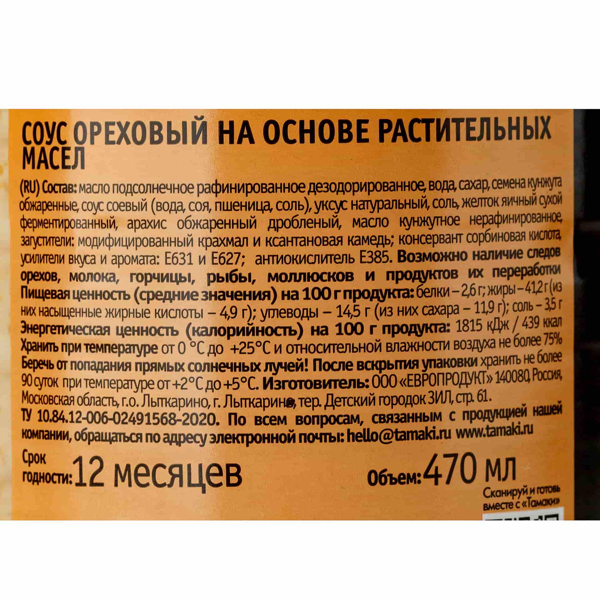 Мягкий нежный ореховый вкус для салатов из водорослей и овощных блюд. Состав: масло подсолнечное рафинированное дезодорированное, вода, сахар, семена кунжута обжаренные, соус соевый (вода, соя, пшеница, соль), уксус натуральный, соль, желток яичный сухой ферментированный, арахис обжаренный дроблёный, масло кунжутное нерафинированное, загустители (модифицированный крахмал, ксантановая камедь), консервант сорбиновая кислота, усилители вкуса и аромата (E631, E627), антиокислитель E385. Возможно наличие следов орехов, молока, горчицы, рыбы, моллюсков и продуктов их переработки. Этот продукт приготовлен в соответствии с нормами халяль. Для просмотра других продуктов халяль перейдите в соответствующую категорию (также можно воспользоваться тегом “халяль” в фильтрах в товарном каталоге).