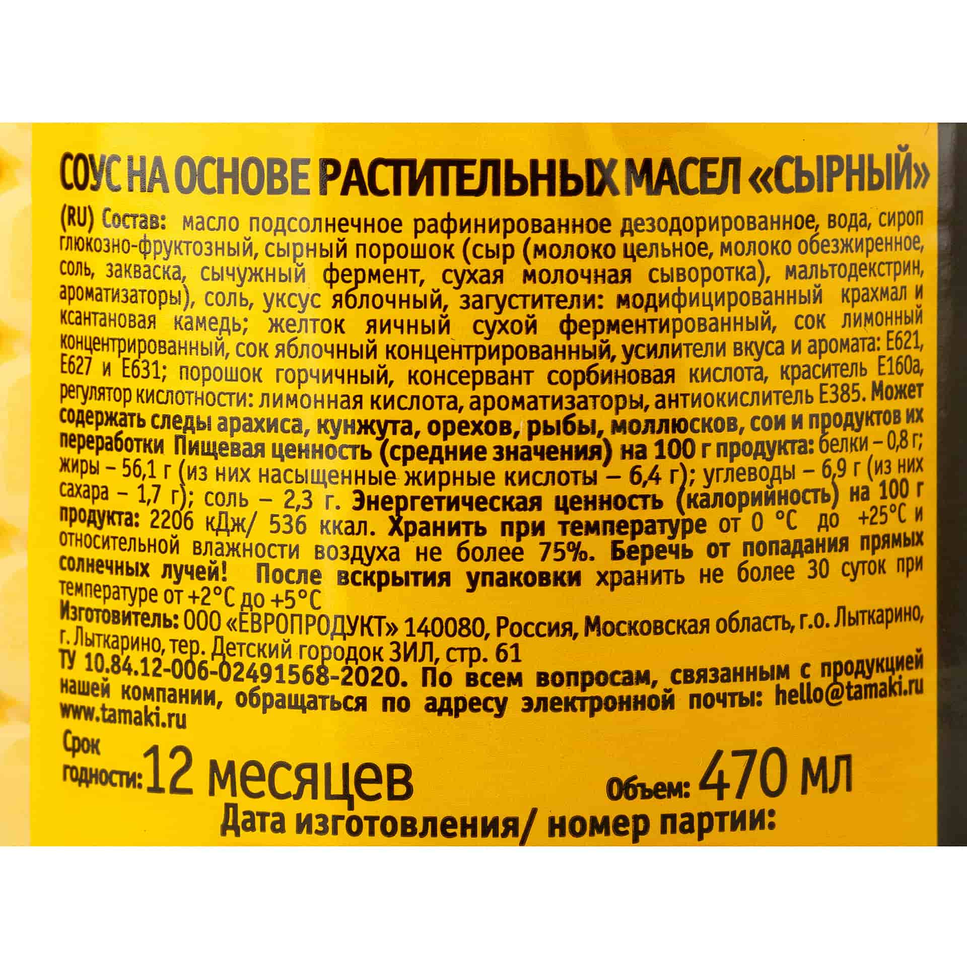 Нежный сливочный вкус выдержанного сыра чеддер. Состав: масло подсолнечное рафинированное дезодорированное, вода, сироп глюкозно-фруктозный, сырный порошок (сыр (молоко цельное, молоко обезжиренное, соль, закваска, сычужный фермент, сухая молочная сыворотка), мальтодекстрин, ароматизаторы), соль, уксус яблочный, загустители (модифицированный крахмал, ксантановая камедь), желток яичный сухой ферментированный, сок лимонный концентрированный, сок яблочный концентрированный, усилители вкуса и аромата (E621, E627 и E631), порошок горчичный, консервант сорбиновая кислота, краситель E160a, регулятор кислотности лимонная кислота, ароматизаторы, антиокислитель E385. Может содержать следы арахиса, кунжута, орехов, рыбы, моллюсков, сои и продуктов их переработки.