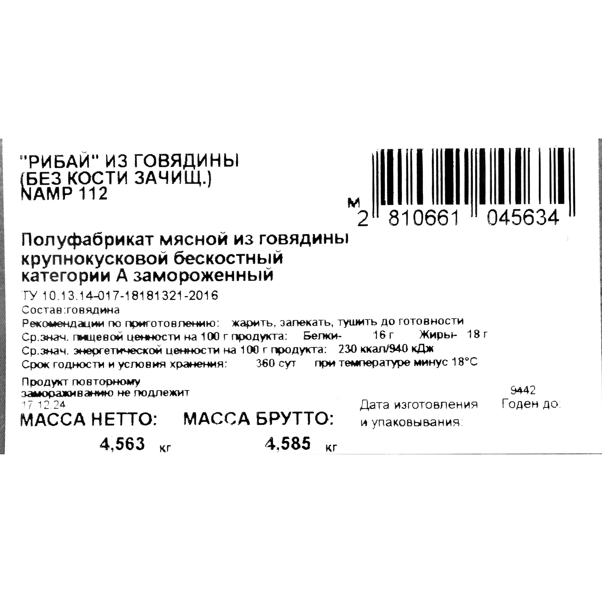 Товар поставляется в индивидуальных упаковках вес нетто которых в среднем около 5 кг. Точный вес товара будет зафиксирован при отгрузке, а стоимость заказа будет пересчитана менеджером. Полуфабрикат мясной из говядины крупнокусковой бескостный категории А замороженный. Состав: говядина (толстый край). Рибай - классика мировой кулинарии, один из известнейших стейков, подающихся в ресторанах и стейкхаусах по всему миру. Вы легко сможете приготовить его дома на обычной сковороде или зажарить на углях на природе.