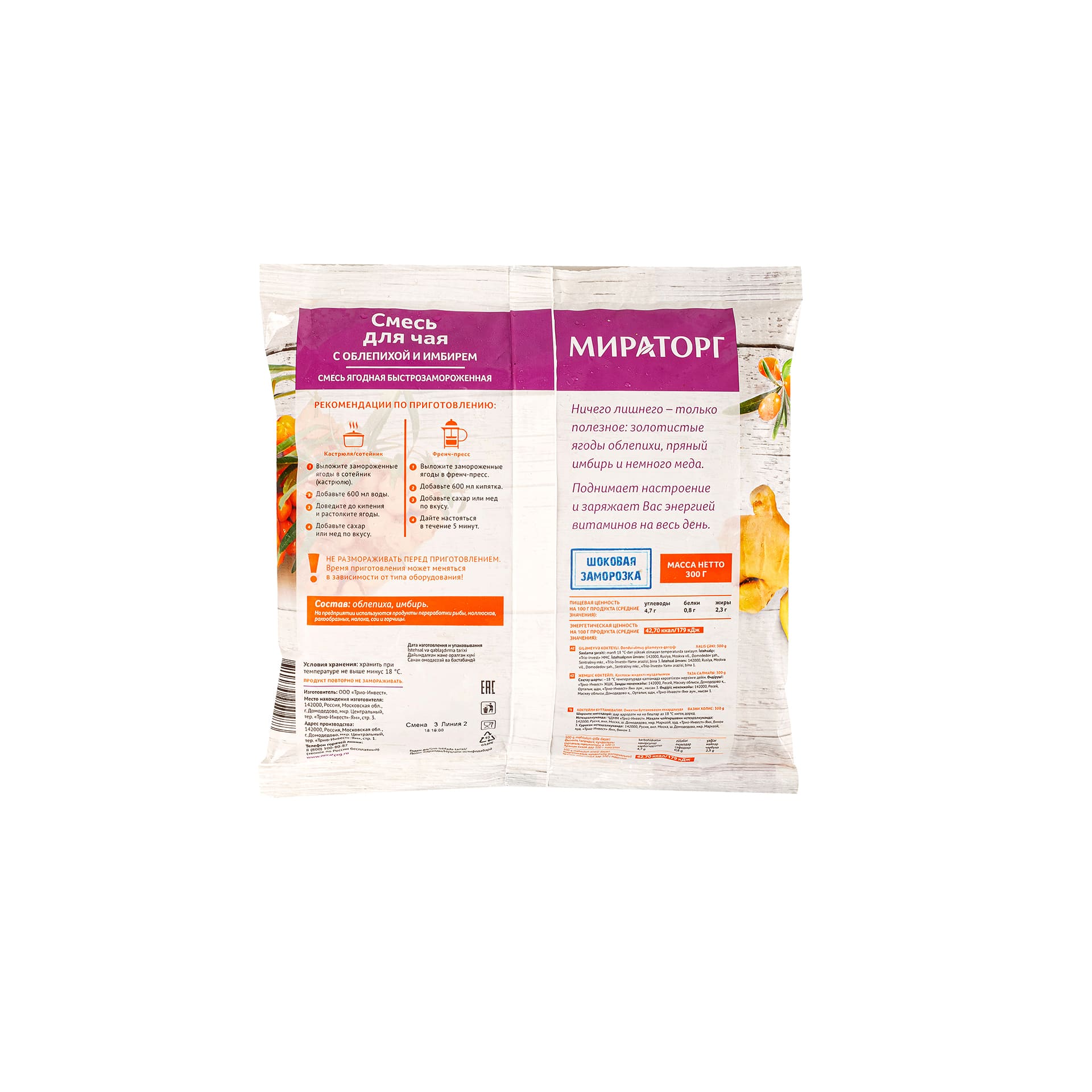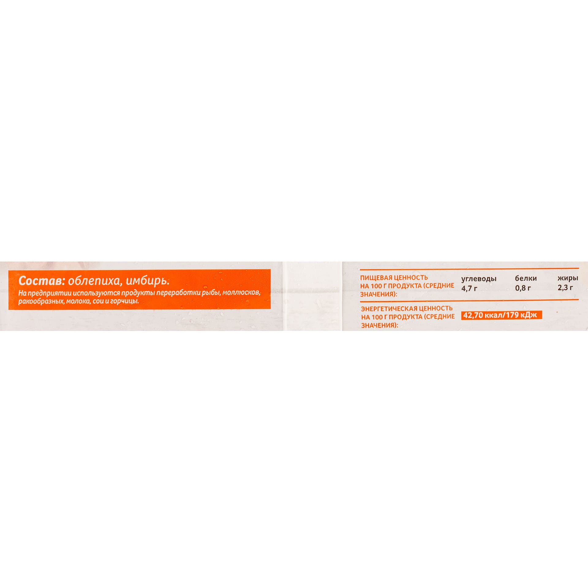 Состав: облепиха, имбирь. На предприятии используются продукты переработки рыбы, моллюсков, ракообразных, молока, сои и горчицы.