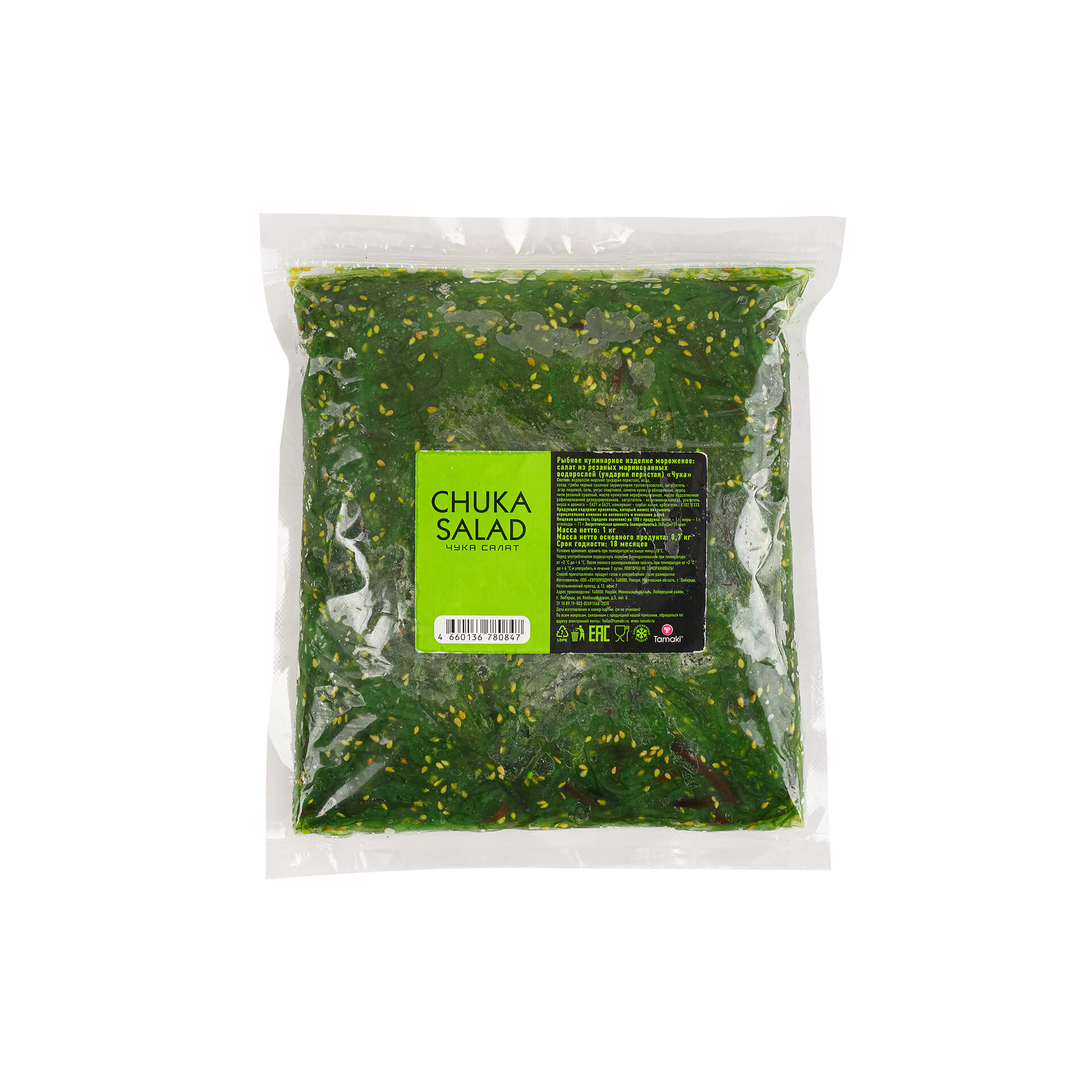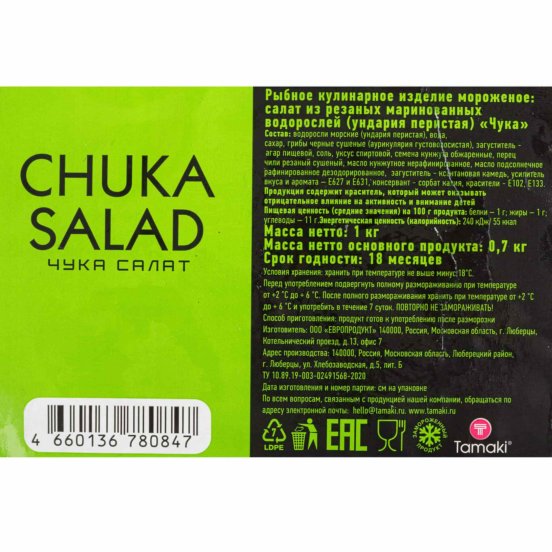 Чтобы купить Замороженный салат из морских водорослей “Чука” Tamaki 1 кг оптом по цене 333 руб., свяжитесь с поставщиком. Компания поставщик — Фростопт (ООО «ЛЕДКОФФ») из города Москва. Минимальная сумма оптового заказа: 6000 руб. Доставка возможна самовывоз, транспортной компанией, автомобилем. Способы оплаты: наличными, безналичная оплата, кредитные карты, электронные деньги.