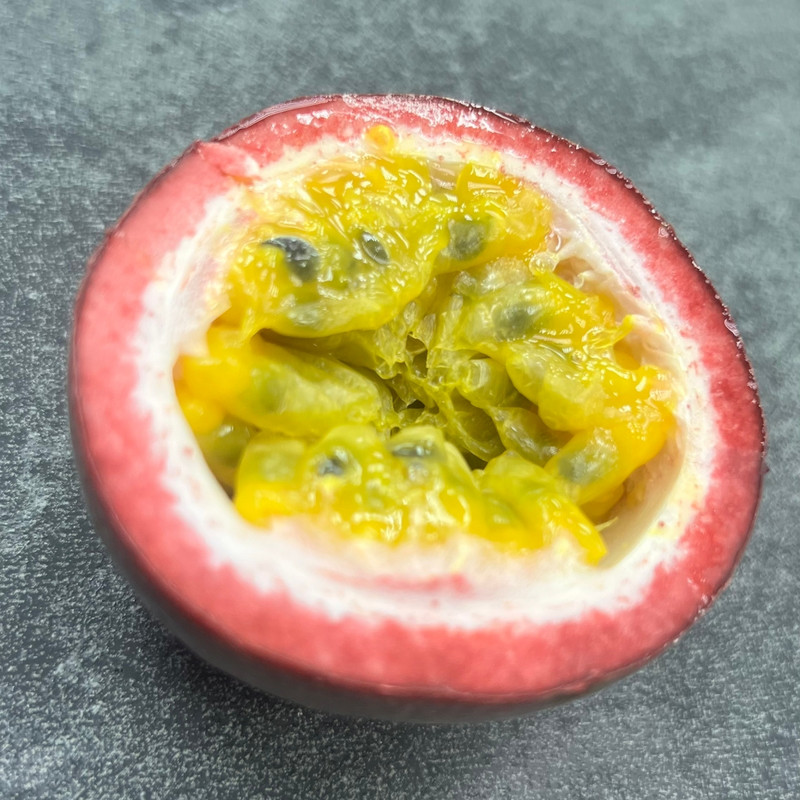 Маракуйя красная Описание: Тропический фрукт среднего размера с красной или бордовой кожурой. Внутри — сочная мякоть с множеством мелких съедобных семян. Мякоть ароматная, яркая и слегка желеобразная по текстуре. Вкус: Сладко-кислый, освежающий, с ярким тропическим ароматом. Семена придают лёгкий хруст, а мякоть насыщенная и сочная, отлично подходит для десертов и напитков. Интересные факты: • Родом из Южной Америки, красная маракуйя ценится за яркий цвет и интенсивный аромат • Богата витамином C, клетчаткой и антиоксидантами • Используется для свежего употребления, смузи, соков, десертов и соусов • Маракуйя известна своими тонизирующими свойствами и способностью повышать настроение.