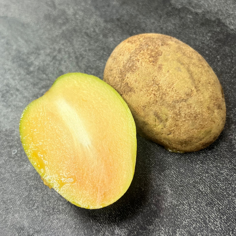 Саподилла (Sapodilla, Chikoo) Описание: Тропический фрукт с коричневой, слегка шершавой кожурой и очень мягкой, сочной мякотью бежево-карамельного оттенка. Внутри — несколько крупных чёрных косточек, которые перед употреблением удаляются. Вкус: Очень сладкий и насыщенный. Во вкусе раскрываются ноты карамели, ириски, мёда и коричневого сахара, с лёгким оттенком груши и фиников. Текстура кремовая, нежная, напоминает спелую хурму. Как есть: Употребляют только полностью спелые плоды. Разрезать пополам, удалить косточки, есть ложкой или нарезать дольками. Важно: Недозрелая саподилла может быть терпкой — мягкость плода при нажатии является главным признаком спелости.