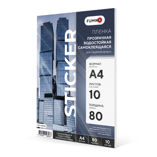 Фотопленка прозрачная водостойкая самоклеящаяся FUMIKO для печати на струйных принтерах. Фотопленка формата А4 и толщиной 80 мкм. Пленка для печати рекламных материалов, информационных макетов, фотографий, стикеров, ценников и другой полиграфии. Подходит для размещения на стеклянных поверхностях или, например, для ванных комнат. Упаковка содержит 10 листов.
