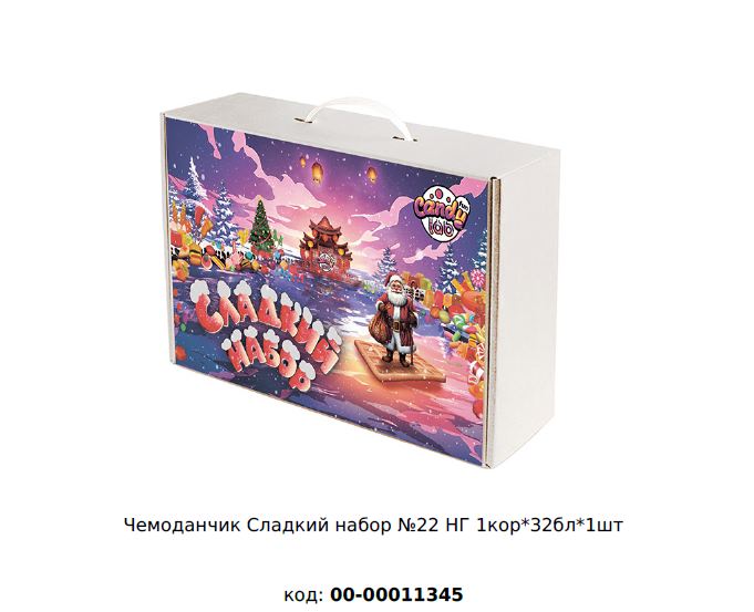 Чтобы купить Чемоданчик. Fun Candy Lab Сладкий набор №22 НГ. 00-00011345 оптом по цене по запросу, свяжитесь с поставщиком. Компания поставщик — Fun Candy Lab (ООО «СФЕРА») из города Москва. Минимальная сумма оптового заказа: 50000 руб. Минимальная партия 32 шт. Доставка возможна самовывоз, транспортной компанией, автомобилем, железной дорогой. Способы оплаты: наличными, безналичная оплата.