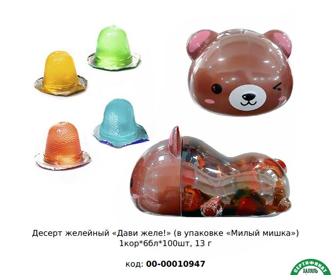 Чтобы купить Десерт желейный "Дави желе!" Fun Candy Lab ХАЛЯЛЬ (в упаковке "Милый мишка") 00-00010947 оптом по цене по запросу, свяжитесь с поставщиком. Компания поставщик — Fun Candy Lab (ООО «СФЕРА») из города Москва. Минимальная сумма оптового заказа: 50000 руб. Минимальная партия 100 шт. Доставка возможна самовывоз, транспортной компанией, автомобилем, железной дорогой. Способы оплаты: наличными, безналичная оплата.
