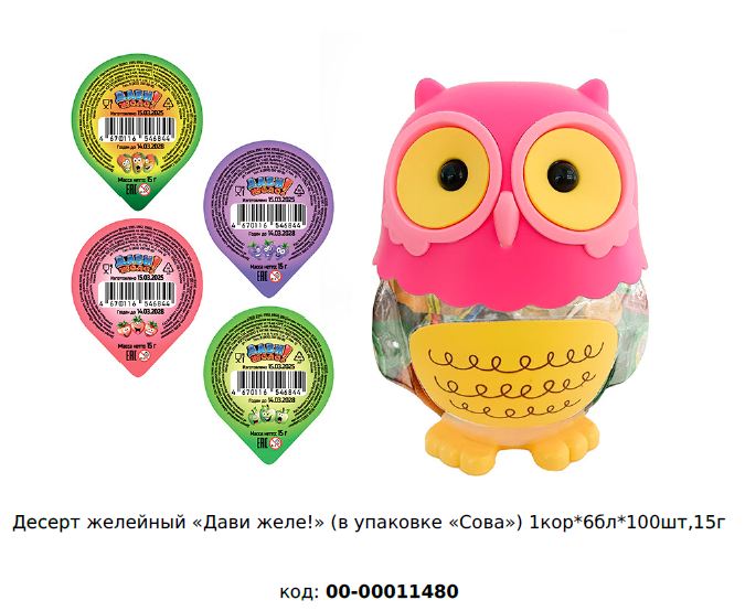 Десерт желейный “Дави желе!” (в упаковке “Сова”) 1кор*6бл*100шт, 15 г