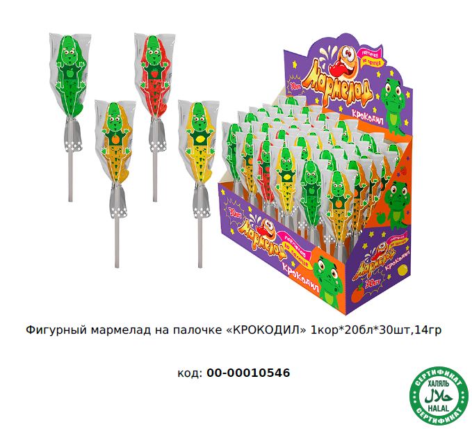 Чтобы купить Фигурный мармелад на палочке Fun Candy Lab ХАЛЯЛЬ "КРОКОДИЛ" 00-00010546 оптом по цене по запросу, свяжитесь с поставщиком. Компания поставщик — Fun Candy Lab (ООО «СФЕРА») из города Москва. Минимальная сумма оптового заказа: 50000 руб. Минимальная партия 30 шт. Доставка возможна самовывоз, транспортной компанией, автомобилем, железной дорогой. Способы оплаты: наличными, безналичная оплата.