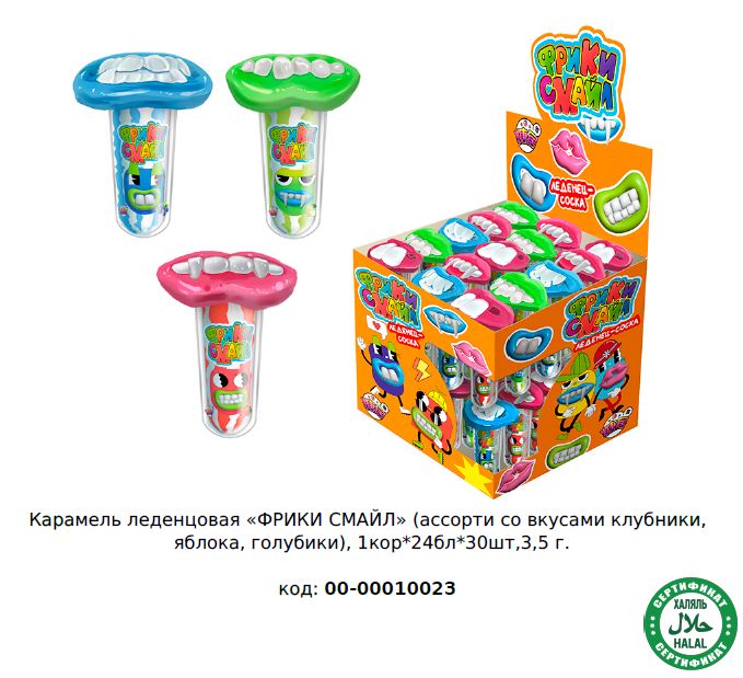 Чтобы купить Карамель леденцовая "ФРИКИ СМАЙЛ" Fun Candy Lab ассорти со вкусами клубники, яблока, голубики 00-00010023 оптом по цене по запросу, свяжитесь с поставщиком. Компания поставщик — Fun Candy Lab (ООО «СФЕРА») из города Москва. Минимальная сумма оптового заказа: 50000 руб. Минимальная партия 30 шт. Доставка возможна самовывоз, транспортной компанией, автомобилем, железной дорогой. Способы оплаты: наличными, безналичная оплата.