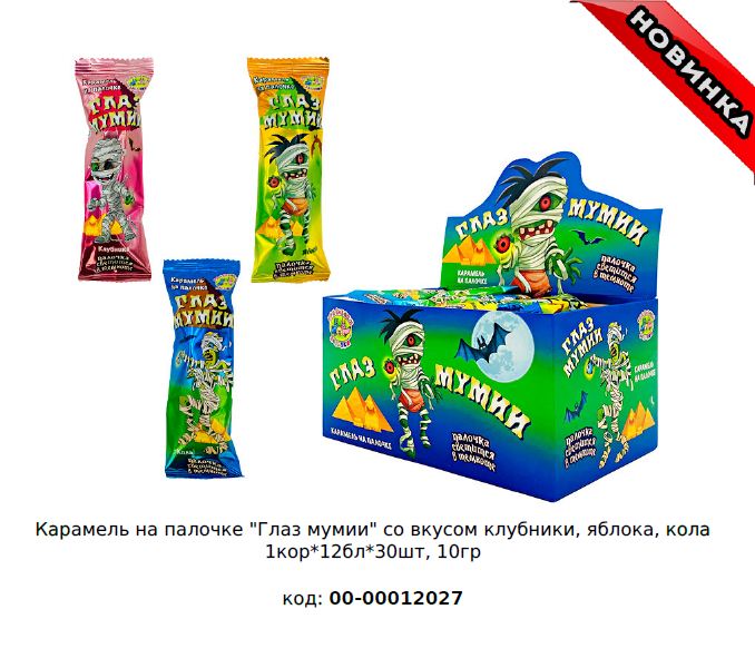 Чтобы купить Карамель на палочке Fun Candy Lab "Глаз мумии" со вкусом клубники, яблока, кола. 00-00012027 оптом по цене по запросу, свяжитесь с поставщиком. Компания поставщик — Fun Candy Lab (ООО «СФЕРА») из города Москва. Минимальная сумма оптового заказа: 50000 руб. Минимальная партия 30 шт. Доставка возможна самовывоз, транспортной компанией, автомобилем, железной дорогой. Способы оплаты: наличными, безналичная оплата.