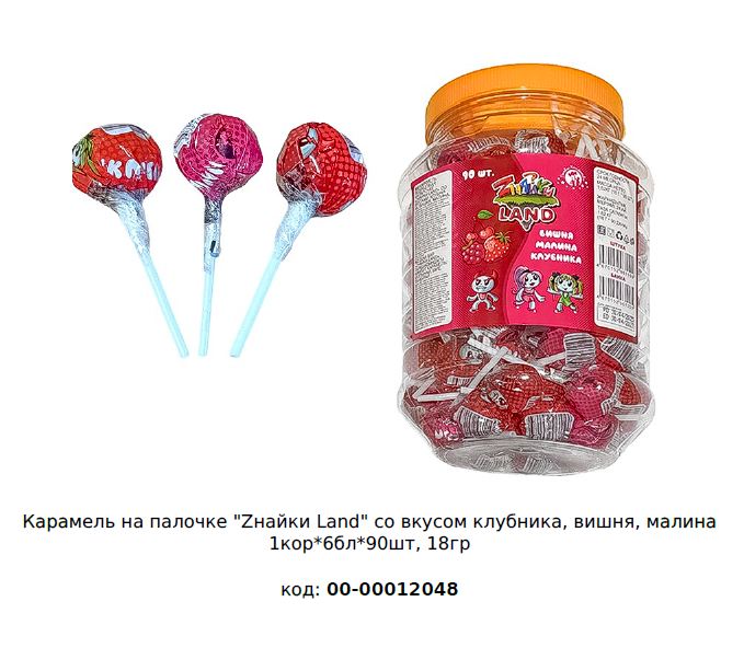 Чтобы купить Карамель на палочке "Zнайки Land" со вкусом клубника, вишня, малина 00-00012048 оптом по цене по запросу, свяжитесь с поставщиком. Компания поставщик — Fun Candy Lab (ООО «СФЕРА») из города Москва. Минимальная сумма оптового заказа: 50000 руб. Минимальная партия 90 шт. Доставка возможна самовывоз, транспортной компанией, автомобилем, железной дорогой. Способы оплаты: наличными, безналичная оплата.