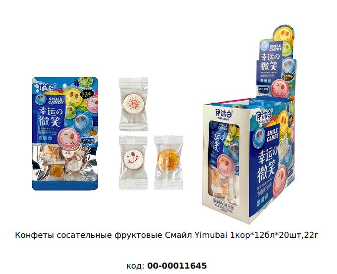 Конфеты сосательные фруктовые Смайл Yimubai 1кор*12бл*20шт, 22 г