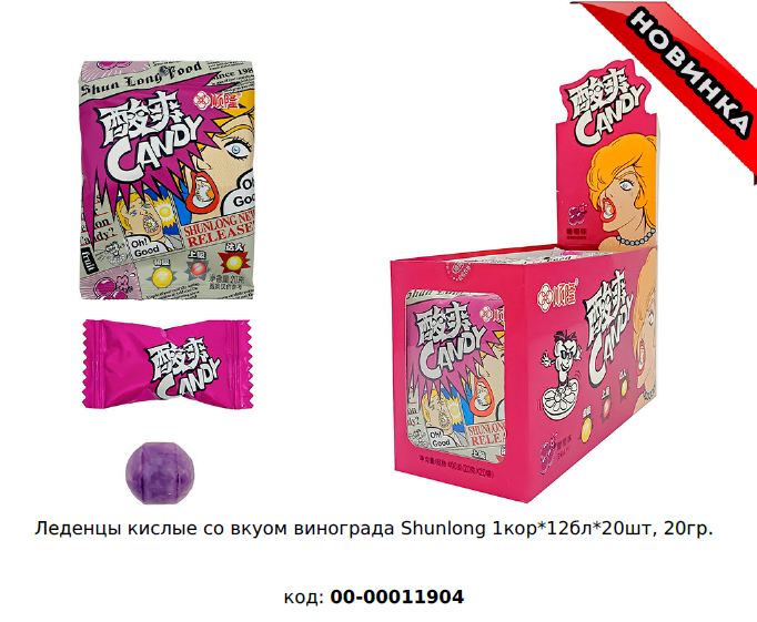 Чтобы купить Леденцы кислые со вкусом ВИНОГРАДА Fun Candy Lab Shunlong 00-00011904 оптом по цене по запросу, свяжитесь с поставщиком. Компания поставщик — Fun Candy Lab (ООО «СФЕРА») из города Москва. Минимальная сумма оптового заказа: 50000 руб. Минимальная партия 20 шт. Доставка возможна самовывоз, транспортной компанией, автомобилем, железной дорогой. Способы оплаты: наличными, безналичная оплата.