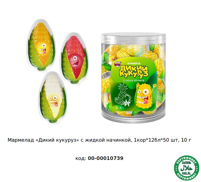 Чтобы купить Мармелад с жидкой начинкой Fun Candy Lab ХАЛЯЛЬ "Дикий кукуруз" 00-00010739 оптом по цене по запросу, свяжитесь с поставщиком. Компания поставщик — Fun Candy Lab (ООО «СФЕРА») из города Москва. Минимальная сумма оптового заказа: 50000 руб. Минимальная партия 50 шт. Доставка возможна самовывоз, транспортной компанией, автомобилем, железной дорогой. Способы оплаты: наличными, безналичная оплата.