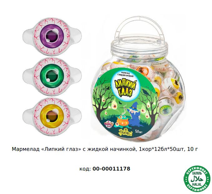 Чтобы купить Мармелад с жидкой начинкой, Fun Candy Lab ХАЛЯЛЬ "Липкий глаз" 00-00011178 оптом по цене по запросу, свяжитесь с поставщиком. Компания поставщик — Fun Candy Lab (ООО «СФЕРА») из города Москва. Минимальная сумма оптового заказа: 50000 руб. Минимальная партия 50 шт. Доставка возможна самовывоз, транспортной компанией, автомобилем, железной дорогой. Способы оплаты: наличными, безналичная оплата.