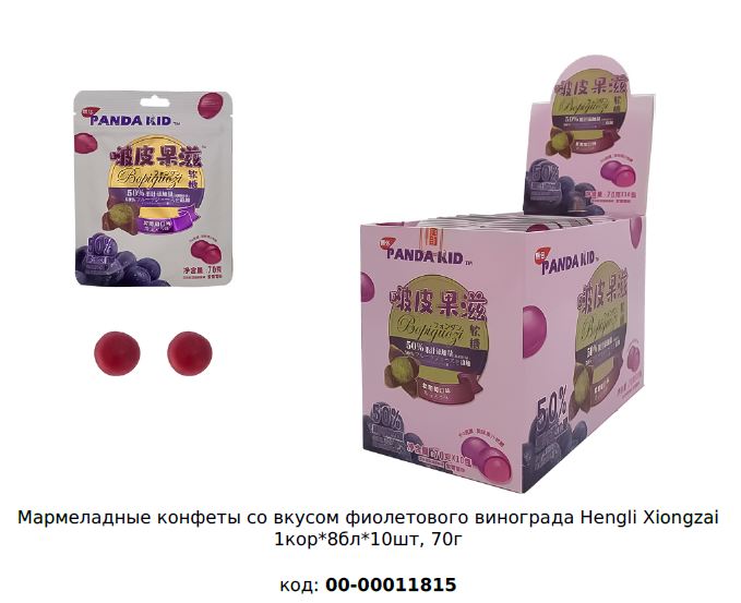 Чтобы купить Мармеладные конфеты со вкусом ФИОЛЕТОВОГО ВИНОГРАДА Fun Candy Lab Hengli Xiongzai 00-00011815 оптом по цене по запросу, свяжитесь с поставщиком. Компания поставщик — Fun Candy Lab (ООО «СФЕРА») из города Москва. Минимальная сумма оптового заказа: 50000 руб. Минимальная партия 10 шт. Доставка возможна самовывоз, транспортной компанией, автомобилем, железной дорогой. Способы оплаты: наличными, безналичная оплата.