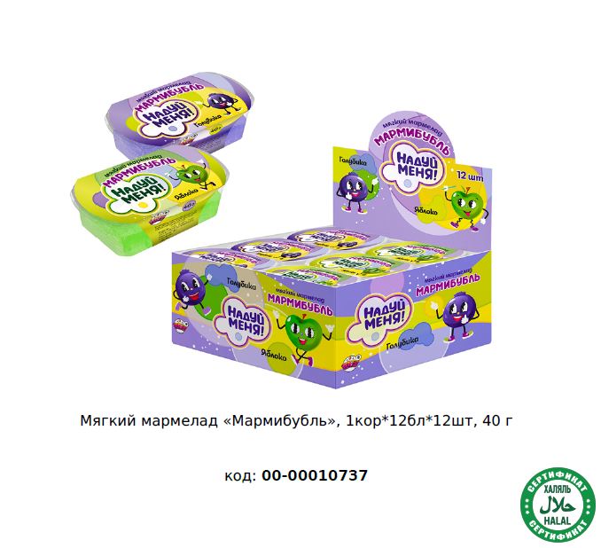 Чтобы купить Мягкий мармелад Fun Candy Lab ХАЛЯЛЬ "Мармибубль" 00-00010737 оптом по цене по запросу, свяжитесь с поставщиком. Компания поставщик — Fun Candy Lab (ООО «СФЕРА») из города Москва. Минимальная сумма оптового заказа: 50000 руб. Минимальная партия 12 шт. Доставка возможна самовывоз, транспортной компанией, автомобилем, железной дорогой. Способы оплаты: наличными, безналичная оплата.