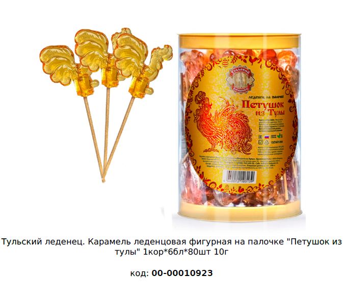 Чтобы купить Тульский леденец. Fun Candy Lab Карамель леденцовая фигурная на палочке "Петушок из тулы" 00-00010923 оптом по цене по запросу, свяжитесь с поставщиком. Компания поставщик — Fun Candy Lab (ООО «СФЕРА») из города Москва. Минимальная сумма оптового заказа: 50000 руб. Минимальная партия 80 шт. Доставка возможна самовывоз, транспортной компанией, автомобилем, железной дорогой. Способы оплаты: наличными, безналичная оплата.