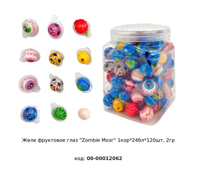 Чтобы купить Желе фруктовое Fun Candy Lab глаз "Zombie Мозг" 00-00012062 оптом по цене по запросу, свяжитесь с поставщиком. Компания поставщик — Fun Candy Lab (ООО «СФЕРА») из города Москва. Минимальная сумма оптового заказа: 50000 руб. Минимальная партия 120 шт. Доставка возможна самовывоз, транспортной компанией, автомобилем, железной дорогой. Способы оплаты: наличными, безналичная оплата.