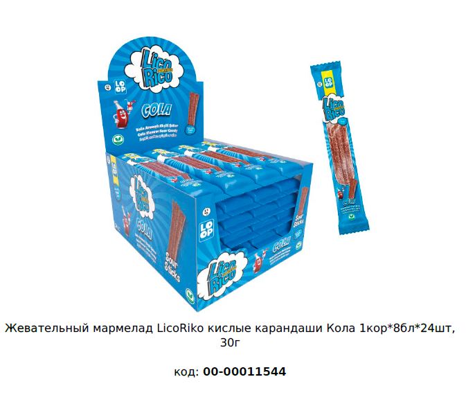 Чтобы купить Жевательный мармелад LicoRiko Fun Candy Lab кислые карандаши Кола 00-00011544 оптом по цене по запросу, свяжитесь с поставщиком. Компания поставщик — Fun Candy Lab (ООО «СФЕРА») из города Москва. Минимальная сумма оптового заказа: 50000 руб. Минимальная партия 24 шт. Доставка возможна самовывоз, транспортной компанией, автомобилем, железной дорогой. Способы оплаты: наличными, безналичная оплата.