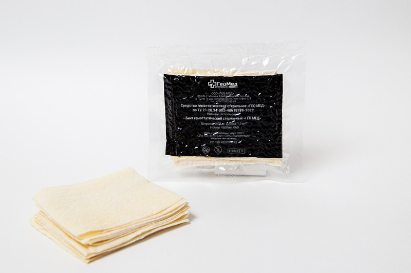 Средство гемостатическое стерильное “ГЕО МЕД” по ТУ 21.20. — бинт гемостатический стерильный “ГЕО МЕД” на основе хитозана (РУ № РЗН 2022⁄19282 от 23.12.2022)
