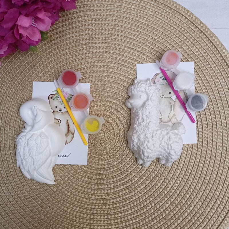 В наборе: большая фигурка, краски 3 цвета, мини кисть, открытка, упаковка пакетик.