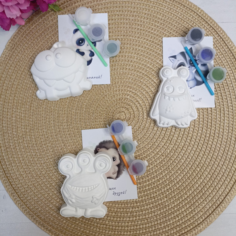 В наборе: большая фигурка, краски 3 цвета, мини кисть, открытка, упаковка пакетик.