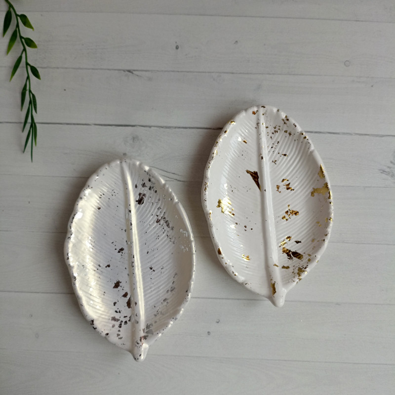 Гипсовая подставка лист, покрыта лаком, задекорирована поталью.