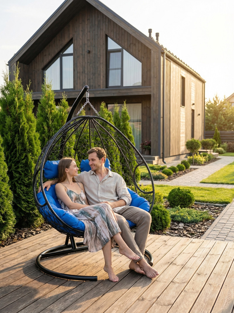 Релакс-зона: Модные подвесные кресла-коконы и уютные садовые качели, создающие атмосферу безмятежного отдыха.